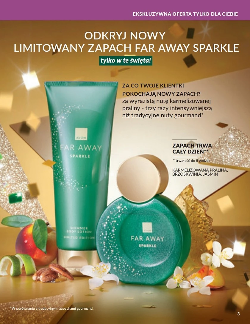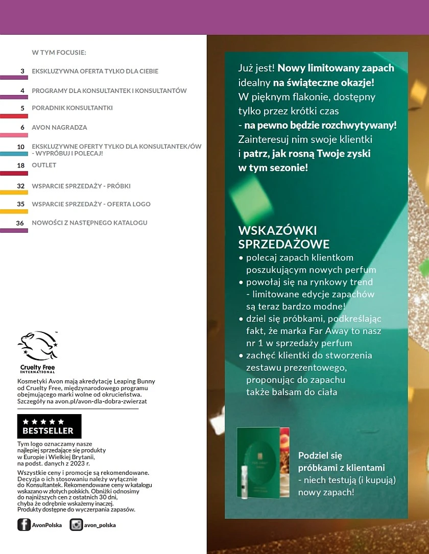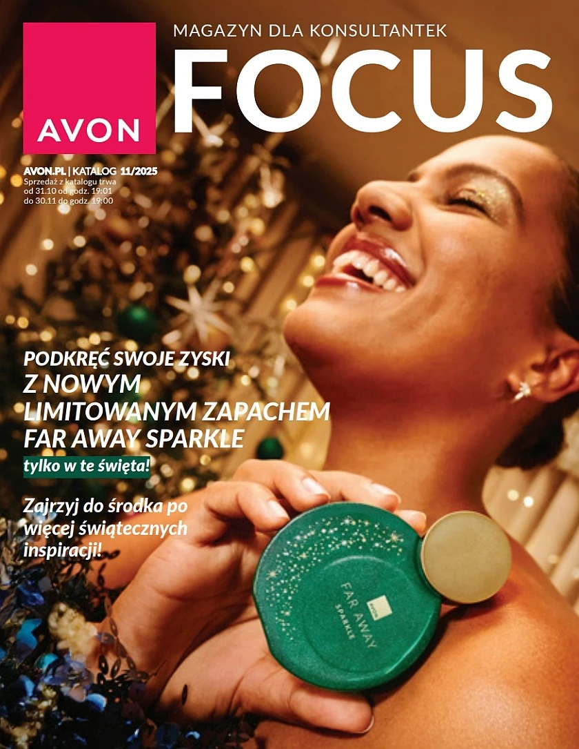 Magazyn Avon Focus 11/2025 obowiązywać będzie przez cały listopad 2025 roku w trakcie trwania kampanii katalogu 11/2025. W listopadowym focusie wśród demo nowości znajdziesz zestawy prezentowe na wybrane kosmetyki. Woda perfumowana Far Away Sparkle, to premiera miesiąca w magazynie i katalogu 11/2025. Zapach można było nabyć wcześniej w poprzednim focusie 10/2025 razem z próbkami.