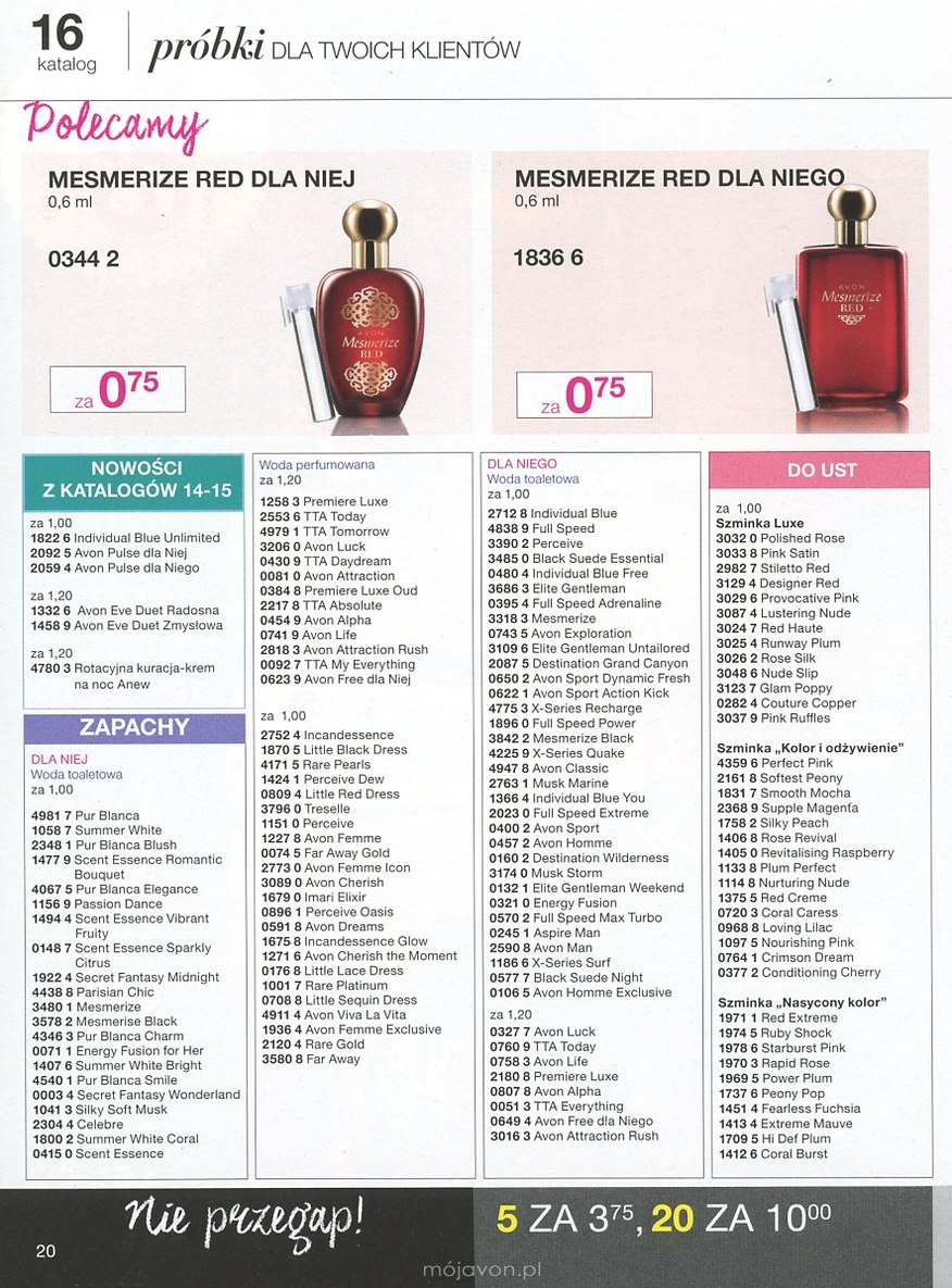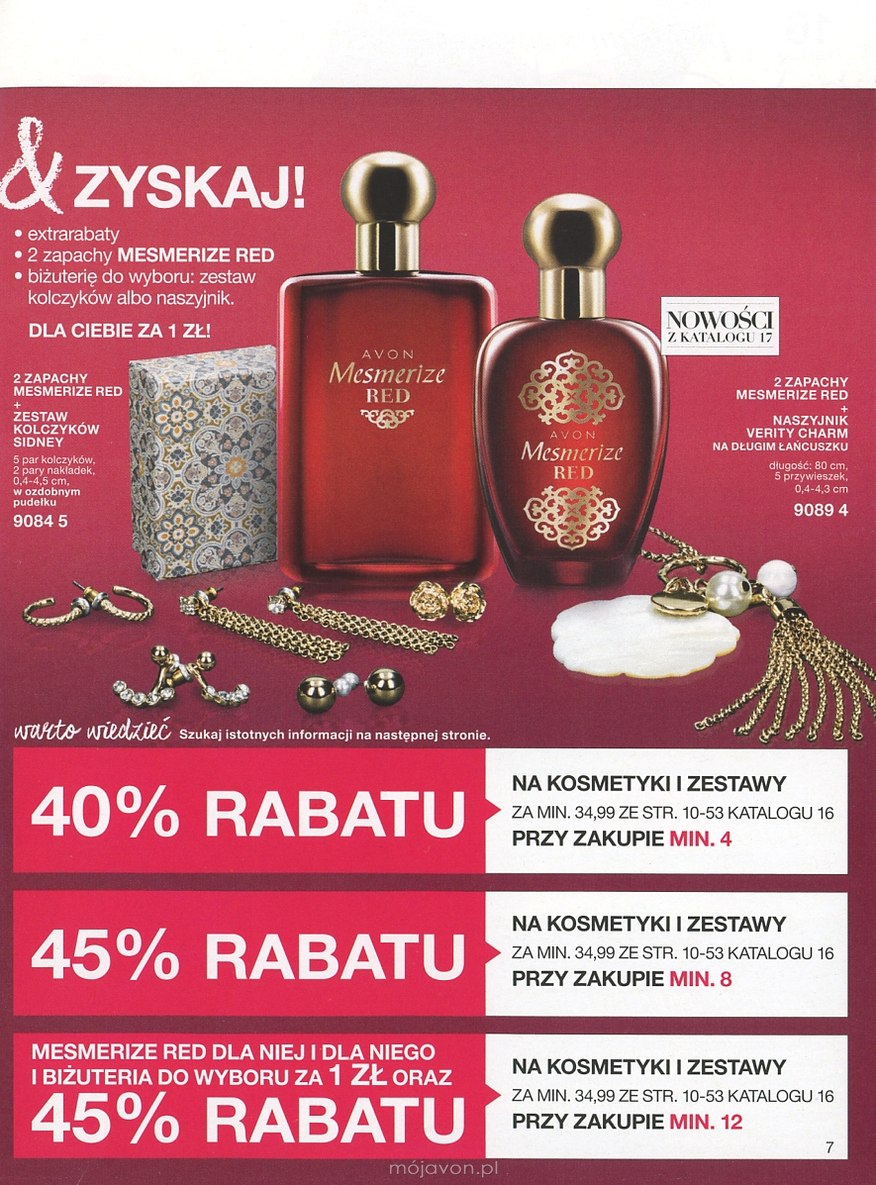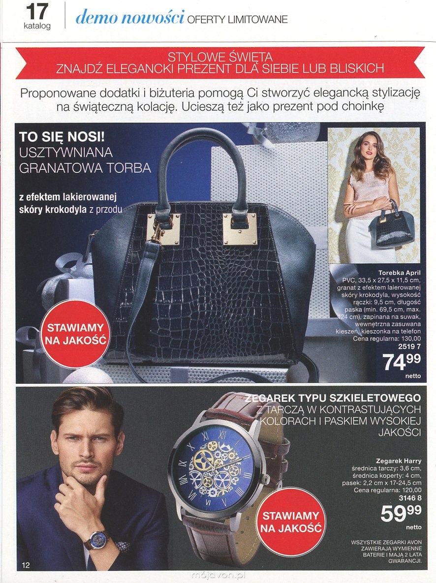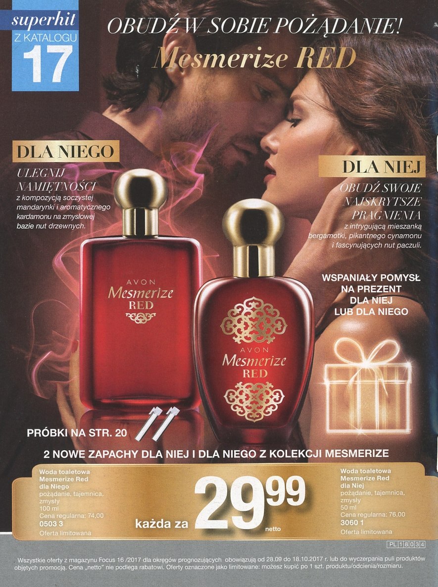 Magazyn Avon Focus 16/2017 obowiązuje od 28 września do 18 października 2017 roku (28.09.2017-18.10.2017). W magazynie, m.in.: oferty promocyjne na zakup nowych zapachów Mesmerize Red dla Nie i dla Niego oraz oferty Demo: damska torebka April oraz zegarek męski Harry.
