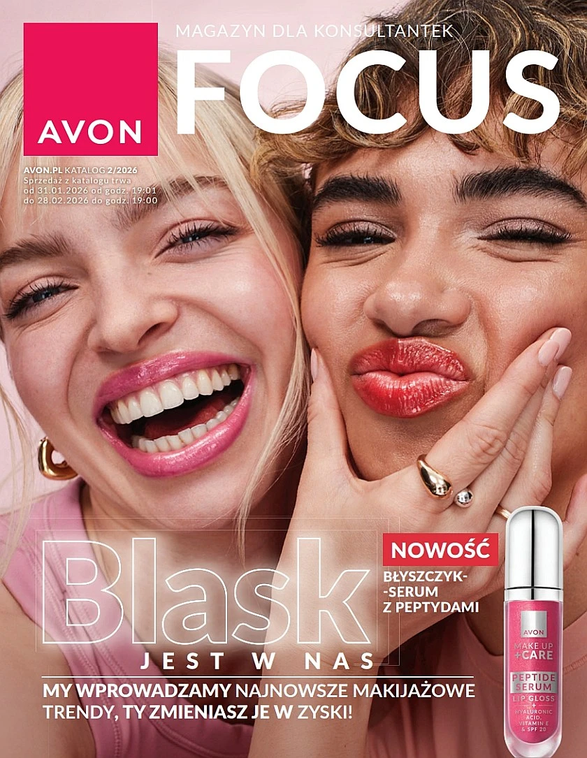 Magazyn Avon Focus 2/2026 obowiązywać będzie przez cały luty 2026 roku w trakcie trwania kampanii katalogu 2/2026. Magazyn na luty to Walentynkowe wydanie. Wśród premier miesiąca znajdziesz peptydowy błyszczyk-serum do ust MAKE UP +CARE, tusz-serum do rzęs, odżywcza kuracja do paznokci 7w1 z kolorem oraz zapach Today Tomorrow Always Today. Szczegóły możesz sprawdzić na pierwszych stronach tego wydania.