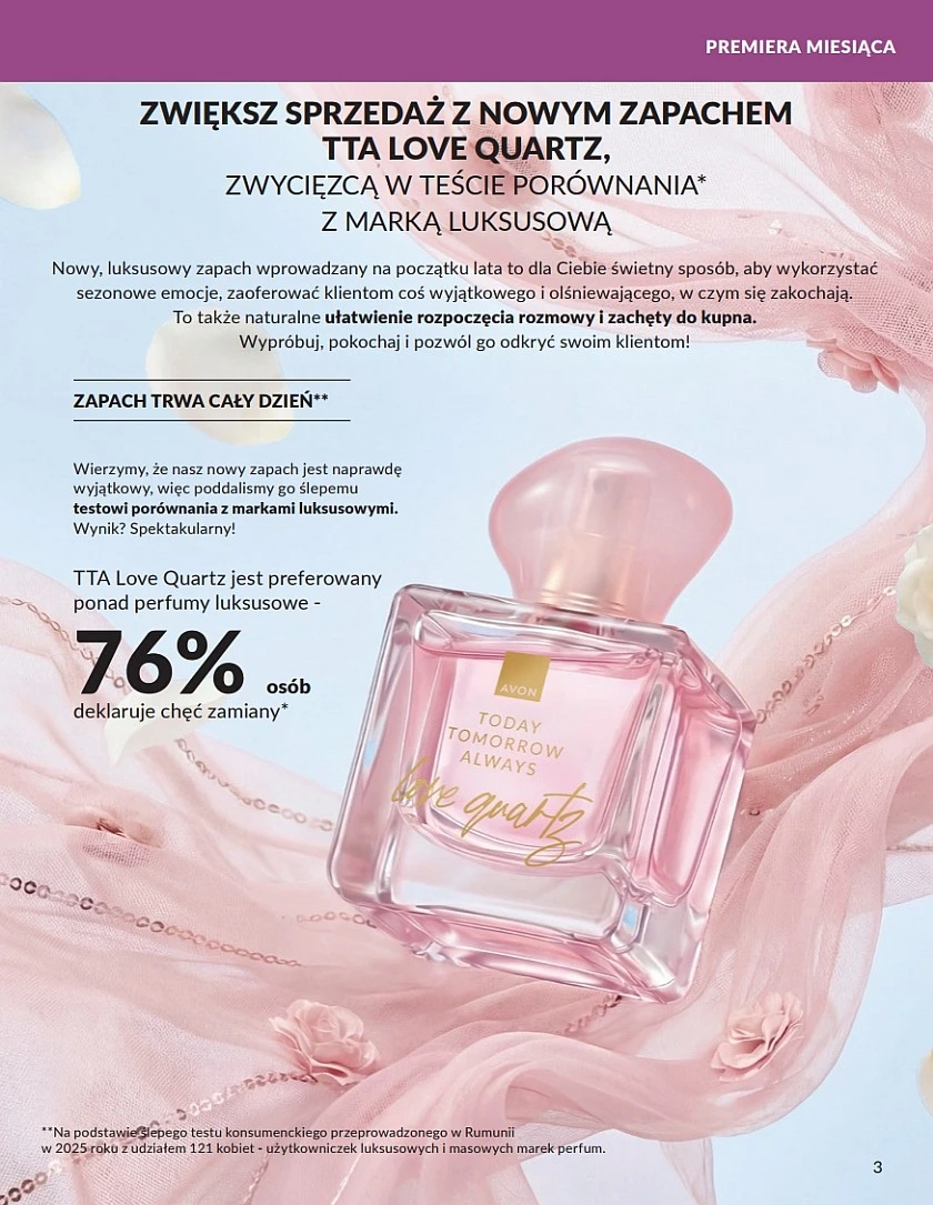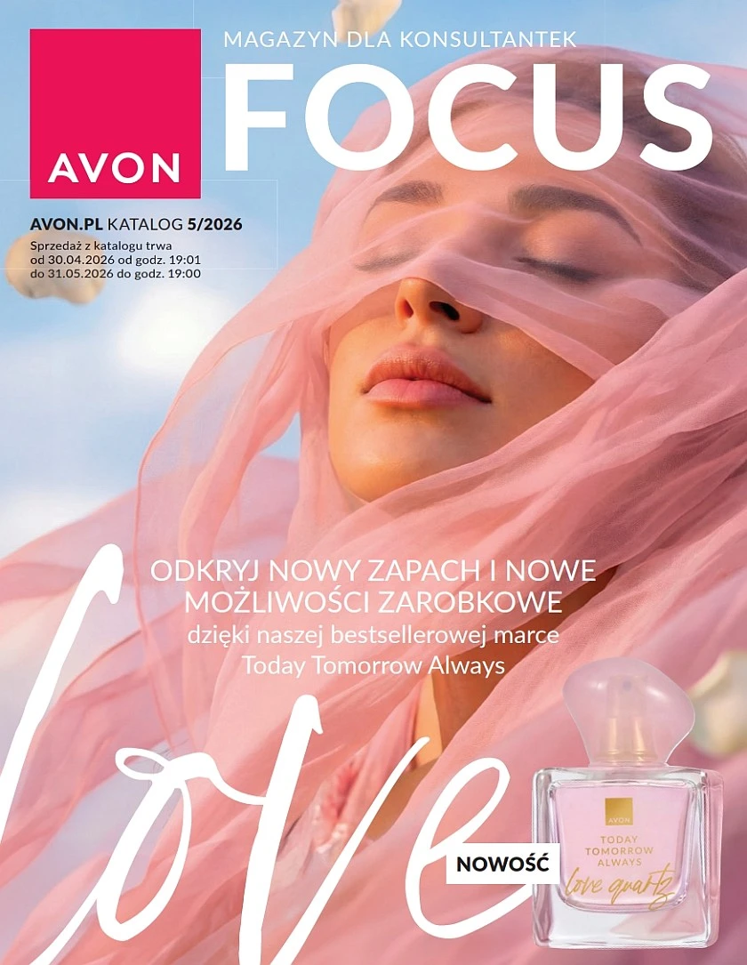 Magazyn Avon Focus 5/2026 obowiązywać będzie przez cały maj 2026 roku w trakcie trwania kampanii katalogu 5/2026. Majowy focus zapowiada spore zmiany w przyszłej ofercie Avon. Z pewnością znasz z drogerii tzw. uzupełniacze mydła w płynie w woreczkach z tworzywa. Oprócz tego, wybrane zapachy Avon również będą dostępne w formie uzupełnienia. Od czerwcowego katalogu, olejek do ust dostępny będzie w kolejnych, dwóch nowych odcieniach. Najgorętszą premierą miesiąca jest woda perfumowana dla kobiet Today Tomorrow Always Love Quartz.