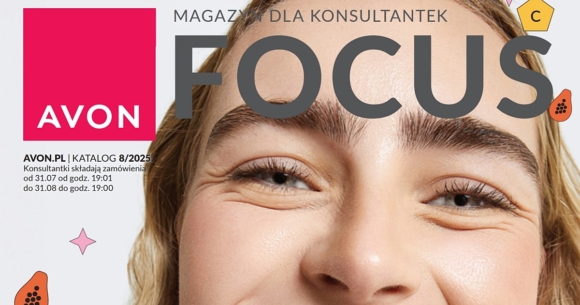 Magazyn Avon Focus 8/2025 obowiązywać będzie przez cały sierpień 2025 roku w trakcie trwania kampanii katalogu 8/2025. Sierpniowy focus oprócz nowości demo prezentuje m.in. oferty na kosmetyki ochronno-pielęgnacyjne do i po opalaniu z linii Avon Care Sun+. Z kolei w outlecie, miłośniczki makijażu znajdą „supertrwały kremowo-pudrowy podkład w kompakcie 18-godzin”.