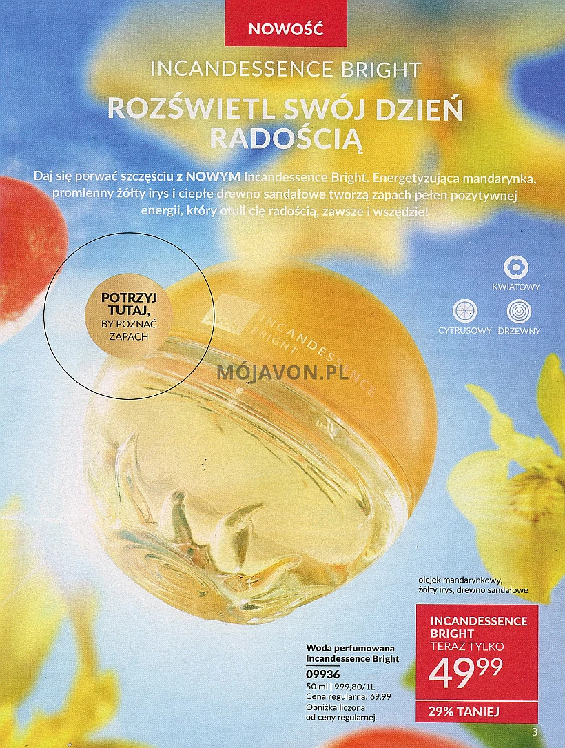 Incandessence Bright – Na koniec największa nowość kwietniowej kampanii. Linia wód perfumowanych dla kobiet Incandessence powiększyła się o zapach Bright z kategorii kwiatowo-cytrusowo-drzewnej. Znajdziesz w nim nuty olejku mandarynkowego, drewna sandałowego oraz żółtego irysa. Flakon zapachu Bright o pojemności 50 ml możesz nabyć w cenie 49,99 zł. Ofertę znajdziesz na pierwszej stronie katalogu.