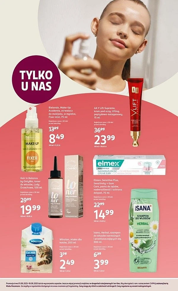 W sierpniowym wydaniu gazetki Rossmann znajdziesz promocje m.in. na kapsułki do prania białych tkanin Persil, tabletki do zmywarki Somat oraz zawieszki do WC Bref. Wśród produktów dla najmłodszych warto wyróżnić promocję na pieluchomajtki Pampers w rozmiarze 5 oraz chusteczki nawilżane dla dzieci Tami Baby. Promocją objęte są również wybrane kosmetyki marki Avon. Oferta promocyjna obejmuje tusz do rzęs Fan-Omenal, ultrakremową pomadkę do ust oraz zapach Perfect Nonsense.