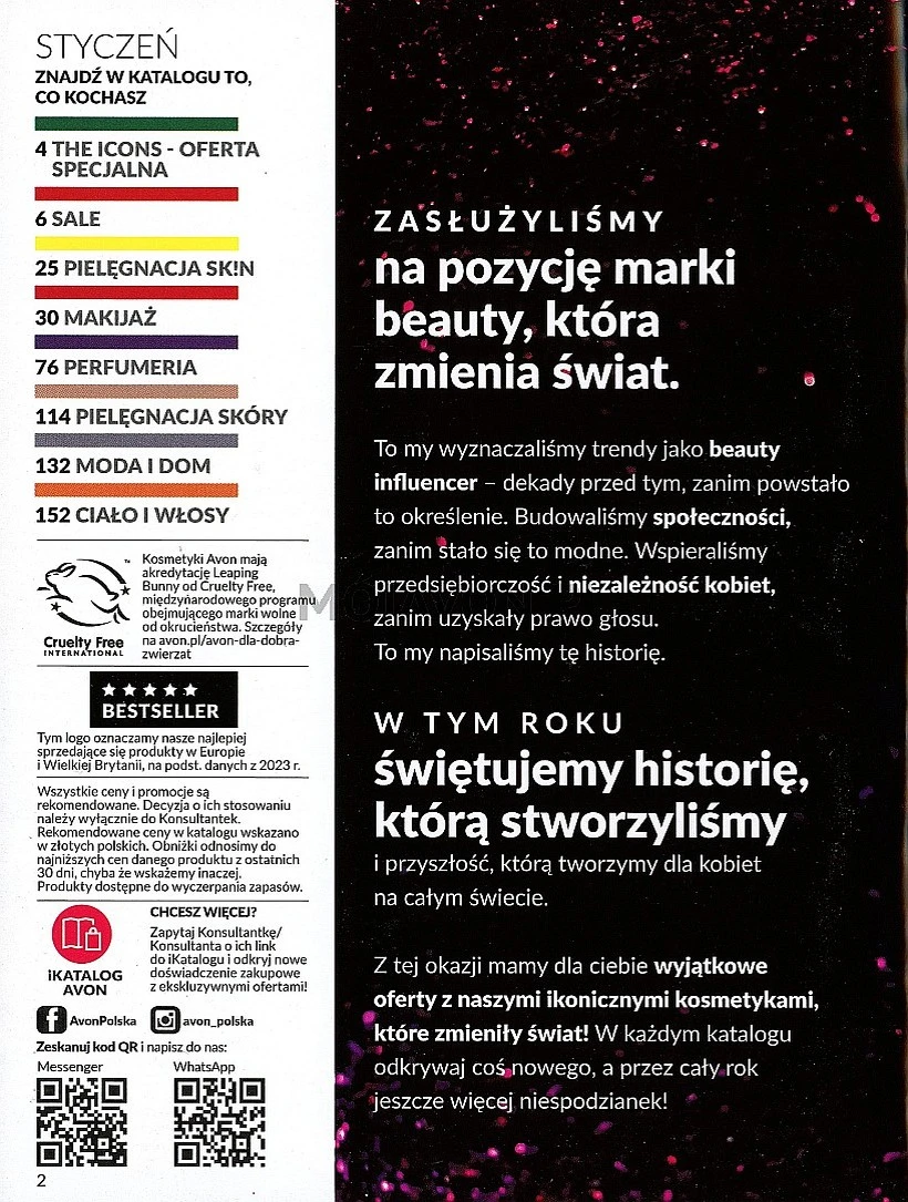 Katalog Avon 1/2026 obowiązywać będzie przez cały styczeń 2026 roku. Styczniowy katalog jest wyprzedażowym wydaniem i prezentuje sporo ofert w obniżonych cenach. Wśród promocji znajdziesz m.in.: wodę perfumowaną dla kobiet Today Tomorrow Always Today, olejek do ust oraz . Tp tylko wybrane promocje tego wydania. Z pełną ofertą wyprzedażową możesz zapoznać się przeglądając katalog online.
