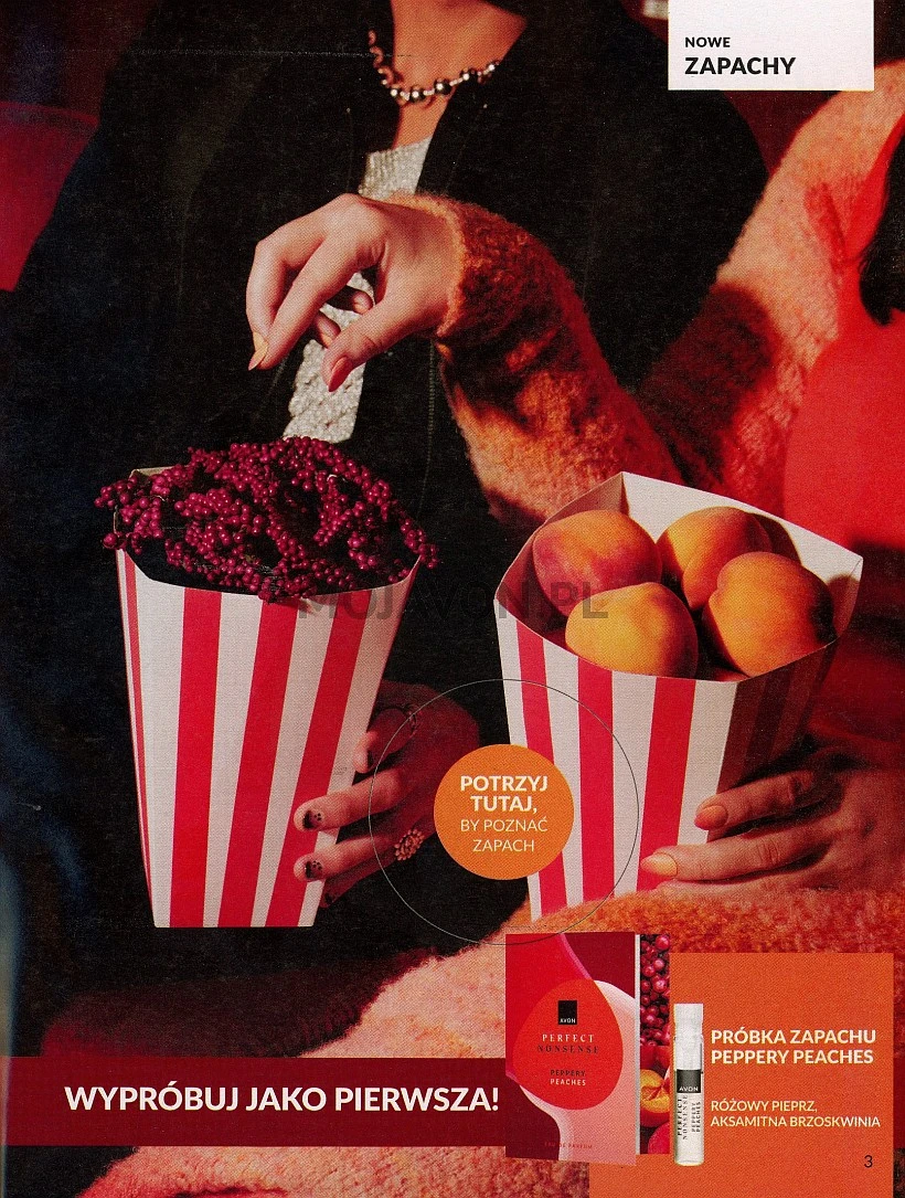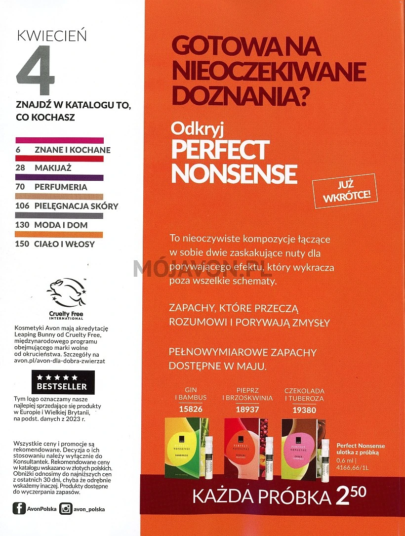 Katalog Avon 4/2025 obowiązywać będzie przez cały kwiecień 2025 roku. Na dwóch pierwszych stronach katalogu prezentowana jest oferta na próbki zapachów dla kobiet z nowej linii Perfect Nonsense, które dostępne będą w trzech odsłonach: gin i bambus, pieprz i brzoskwinia oraz czekolada i tuberoza. Dlaczego tylko próbki? Perfect Nonsense, to nowość majowego katalogu 5/2025 i pełnowymiarowe flakony tych wód perfumowanych pojawią się w ofercie majowego wydania. Już teraz jednak, możesz nabyć próbki tych zapachów i sprawdzić, który będzie dla Ciebie najlepszy.