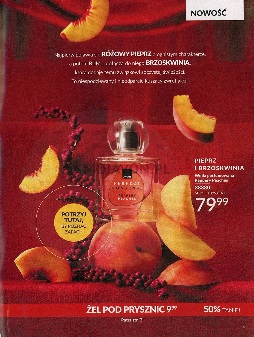 Perfect Nonsense, to nowa linia wód perfumowanych dla kobiet, która zapowiadana była już wcześniej, we wcześniejszej edycji katalogu Avon i magazynu Focus. W poprzednim katalogu można było zamówić próbki zapachów, aby ocenić je i przetestować przed zakupem pełnowymiarowego flakonu o pojemności 50 ml. Każdy z zapachów dostępny jest w cenie 79,99 zł. Czy staną się bestsellerami Avon? Czas pokaże. Szanse z pewnością mają. Zainteresowanie nimi jest, co potwierdza pojawienie czwartego zapachu w tej linii, Ginger Blaze w katalogu 10/2025. Oferty na te wody perfumowane znajdziesz na pierwszych stronach majowego wydania. Premierowo pojawiły się 3 zapachy: Peppery Peaches, Bamboozie Cocktail i Choco Tuberose. A teraz nieco informacji o każdym z tych zapachów.