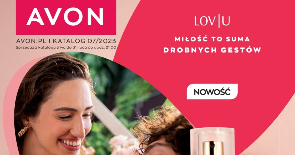 Lov U – Dział katalogu z zapachami Avon powiększył się o nowy zapach. Gdy został udostępniony katalog 6/2023 ten nowy zapach mogłyście poznać zamawiając jego próbkę. W lipcowe wydania, oprócz próbki, dostępny jest też flakonik o pojemności 50 ml. Lov U, to woda perfumowana dla kobiet z kategorii kwiatowo-owocowej. Znajdziesz tutaj nuty esencji malinowej, róży i drewna kaszmirowego. Zapach możesz nabyć osobno w cenie 69,99 zł lub w zestawie z balsamem do ciała Lov U w cenie 79,99 zł. Szczegóły znajdziesz na pierwszych stronach.