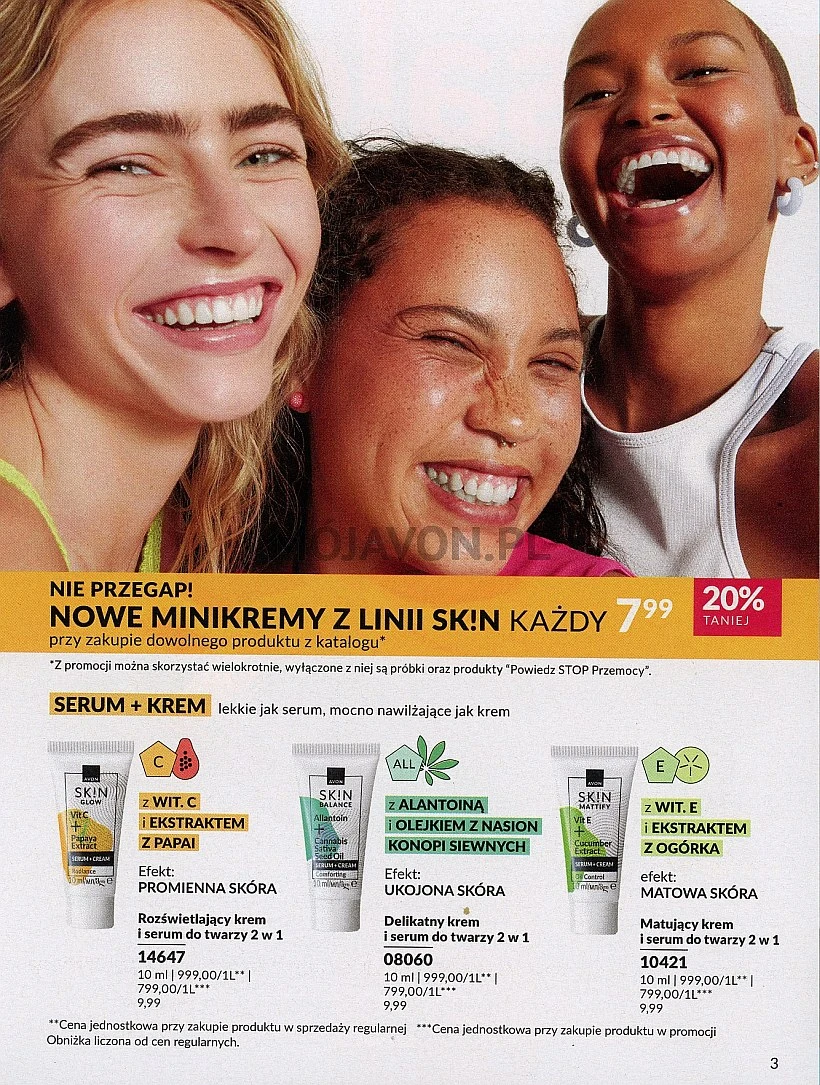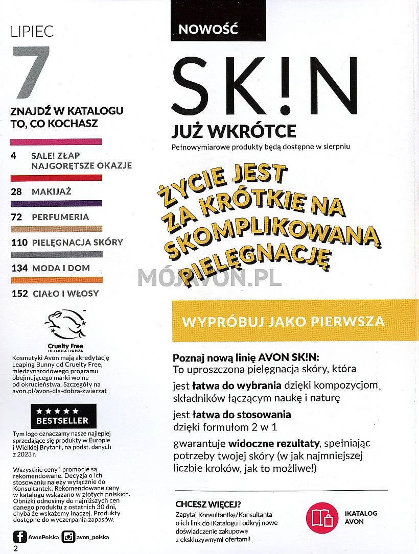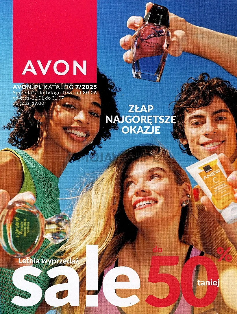 Katalog Avon 7/2025 obowiązywać będzie przez cały lipiec 2025 roku. Lipcowy katalog, to wyprzedażowa oferta. Oznacza to, że w tym wydaniu znajdziecie więcej ofert w obniżonych cenach niż zwykle. Na ogół, wyprzedażowe katalogi prezentują mniej nowości, a więcej promocji. Tak też jest i tym razem. Na pierwszych stronach wydania, zamiast nowości, znajdziesz oferty promocyjne na wybrane produkty marki Avon. Wśród nich znajdziesz m.in. zapachy damskie i męskie, wybrane tusze do rzęs, błyszczyki do ust oraz kosmetyki do pielęgnacji cery z linii Anew.