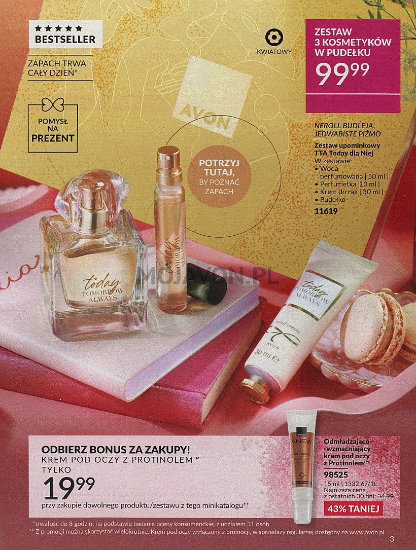 Na pierwszych stronach minikatalogu znajdziesz zestawy upominkowe z wybranymi zapachami Today Tomorrow Always. Pierwszy zestaw składa się z wody perfumowanej dla kobiet TTA Wonder i rozświetlającego balsamu do ciała TTA Wonder. Zapach Wonder należy do kategorii kwiatowo-piżmowej i znajdziesz w nim nuty: pąków neroli, bergamotki i drewna cedrowego. Zestaw możesz nabyć w cenie 94,99 zł. Drugi zestaw składa się z wody perfumowanej Today Tomorrow Always, perfumetki i kremu do rąk TTA Today. Zapach Today należy do kategorii kwiatowej. Zestaw możesz nabyć w cenie 99,99 zł. Szczegóły ofert na stronach 2-3.